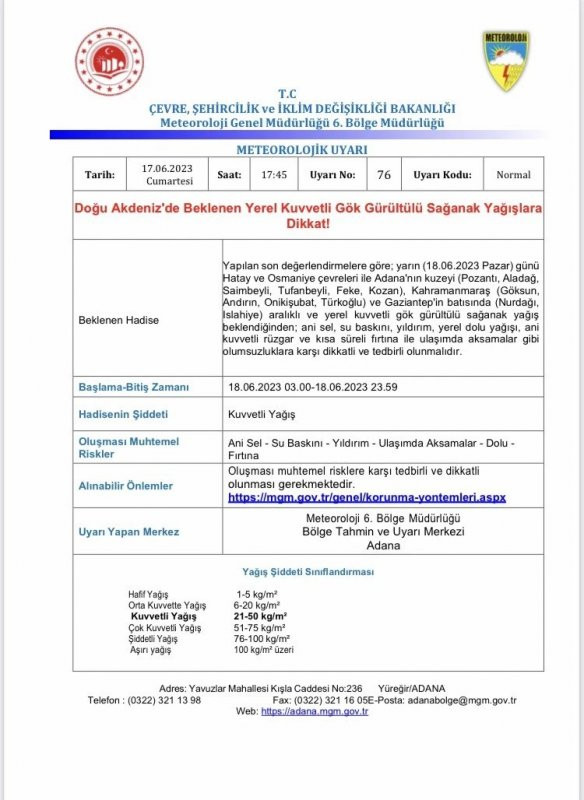 Meteoroloji Genel Müdürlüğü verilerini paylaşan Gaziantep Valiliği’nden yapılan açıklamada, “18.06.2023 Pazar günü Gaziantep'in batısında (Nurdağı ve İslahiye) aralıklı ve yerel kuvvetli gök gürültülü sağanak yağış beklendiğinden; ani sel,su baskını, yıldırım,dolu yağışı, ani kuvvetli rüzgar ve kısa süreli fırtına vb. olumsuzluklara karşı dikkatli ve tedbirli olunmalıdır.”denildi. Öte yandan meteorolojiden yapılan duyuruda ise, “Yapılan son değerlendirmelere göre; yarın (18.06.2023 Pazar) günü Hatay ve Osmaniye çevreleri ile Adana'nin kuzeyi (Pozantı, Aladağ, Saimbeyli, Tufanbeyli, Feke, Kozan), Kahramanmaras (Göksun Andirin, Onikişubat, Türkoğlu) ve Gaziantep'in batısında (Nurdağı İslahiye) aralıklı ve yerel kuvvetli gök gürültülü sağanak yağış beklendiğinden; ani sel, su baskını, yıldırım, yerel dolu yağışı,ani kuvvetli rüzgar ve kısa süreli fırtına ile ulaşımda aksamalar gibi olumsuzluklara karşı dikkatli ve tedbirli olunmalıdır.”diye uyarıda bulunuldu.