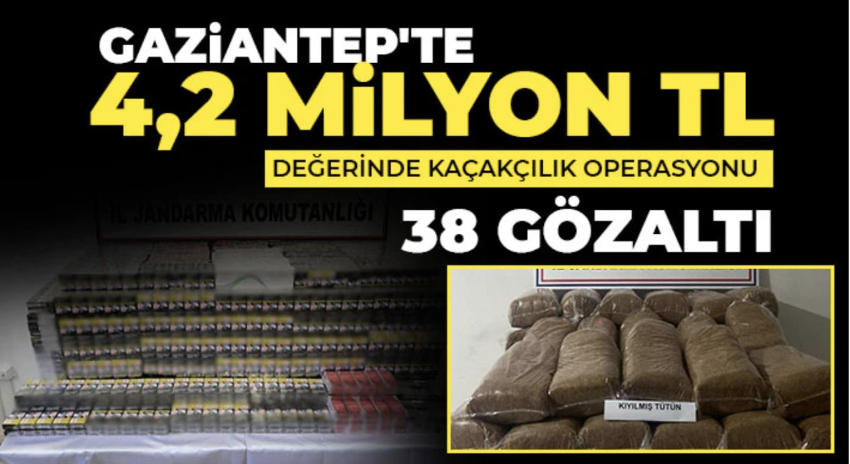 Gaziantep'te jandarma ekiplerince yapılan operasyonlarda 4 milyon 283 bin TL değerinde gümrük kaçağı tütün ve sigara ele geçirildi. Operasyon sonucunda gözaltına alınan 38 şüpheli hakkında yasal işlem başlatıldı.