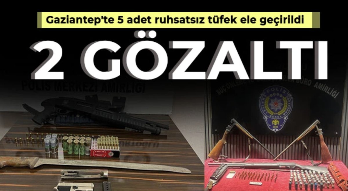 Gaziantep Emniyet Müdürlüğü'ne bağlı Şahinbey İlçe Emniyet Müdürlüğü ekipleri, silah kaçakçılığına yönelik çalışma yaptı. Yapılan çalışmalar neticesinde 4 adet ruhsatsız tüfek, 1 adet kurusıkı tabanca ve 235 adet fişek ele geçirildi. Olayla ilgili gözaltına alınan 2 şüpheli hakkında yasal işlem başlatıldı.