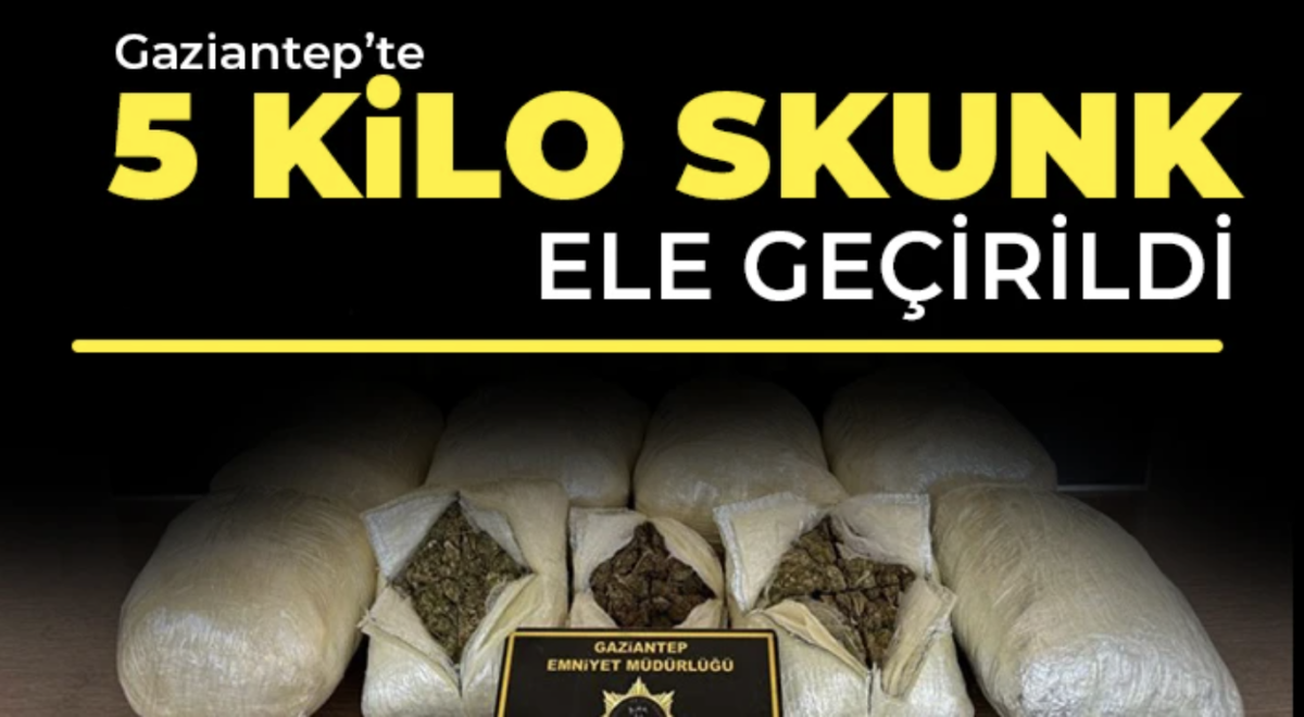 Gaziantep İl Emniyet Müdürlüğüne bağlı Narkotik Suçlarla Mücadele ekipleri ve Cumhuriyet Başsavcılığı koordinesinde uyuşturucuyla mücadeleye yönelik operasyon düzenledi. Operasyonda bir araçta 5 kilo skunk ele geçirildi. Operasyonda 2 şüpheli gözaltına alındı. Gözaltına alınan 2 şüpheli hakkında yasal işlem başlatıldı.