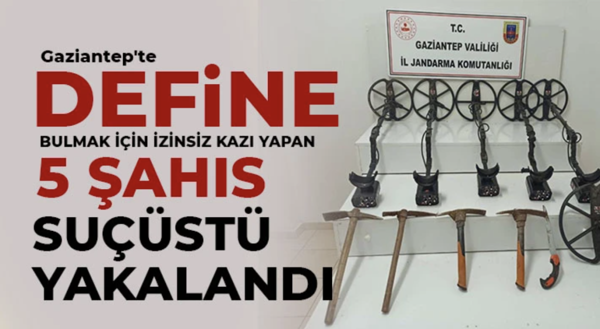 Gaziantep'te define bulmak amacıyla izinsiz kazı yaptığı tespit edilen 5 şahıs, jandarma ekiplerince suçüstü yakalandı.