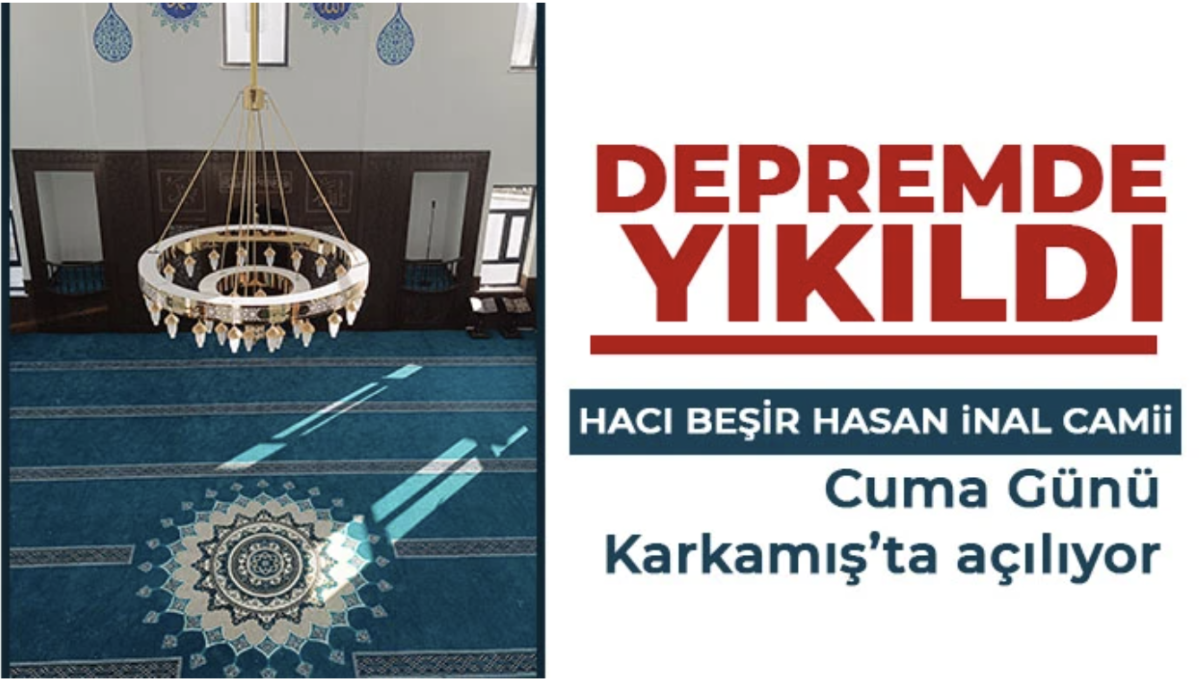 Asrın felaketinde yıkılan Karkamış Çarşı mahallesindeki camii Hacı Beşir Hasan İnal'ın çocukları tarafından yeniden yaptırıldı Hacı Beşir İnal Cami Cuma namazına müteakip hizmete açılacak.  Cuma namazı sonrası yemek ikramı da yapılcağı açılış törenine Karkamış ve bölge halkı davetlidir.