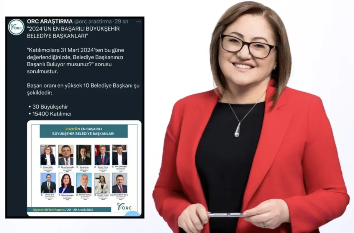 20-29 Aralık 2024 tarihleri arasında gerçekleştirilen araştırmada, 30 büyükşehirde toplam 15 bin 400 kişi ile yapılan ankette, "31 Mart 2024 seçimlerinden bugüne kadar ki süreçte, belediye başkanınızı başarılı buluyor musunuz" sorusu soruldu.Fatma Şahin vatandaşlardan en yüksek güven oyunu alarak en başarılı büyükşehir belediye başkanı oldu. Şahin, Gaziantep'te yaptığı projeler sayesinde hem Gazianteplilerden hemde Türkiye'nin bir çok yerinde vatandaşların takdirini toplayarak vatandaşla bağ kurduğunu gösterdi.