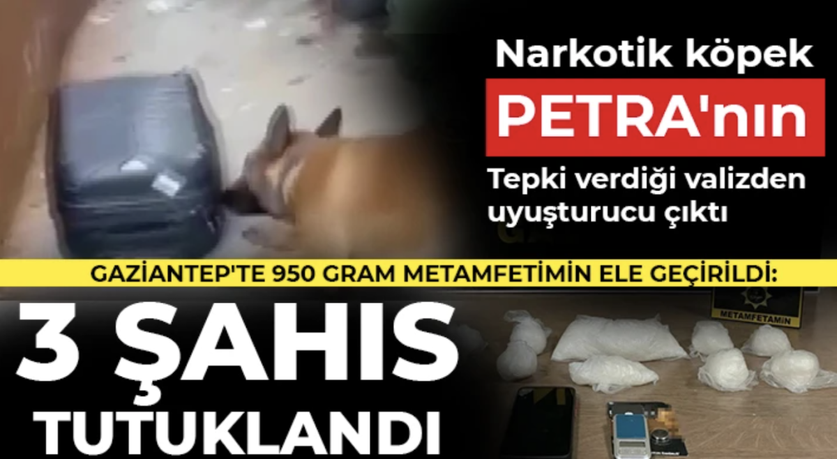 Operasyon sırasında ele geçirilen uyuşturucu maddelerin narkotik köpek Petra'nın tepki verdiği valizden çıkması is dikkat çekti. Gaziantep'te İl Emniyet Müdürlüğü Narkotik Suçlarla Mücadele Şube Müdürlüğü ekipleri ve Cumhuriyet Başsavcılığı koordinesinde uyuşturucu operasyonu yapıldı. Operasyon çerçevesinde 2 ikamet ve bir araçta arama yapıldı. Yapılan aramalar sırasında hassas burunlu narkotik köpek Petra'nın tepki verdiği valizden 950 gram metamfetamin ile 1 adet hassas terazi ele geçirildi. Operasyon sonucunda 3 şüpheli gözaltına alındı. Tamamlanan yasal işlemlerin ardında adli mercilere sevk edilen 3 şüpheli tutuklandı.