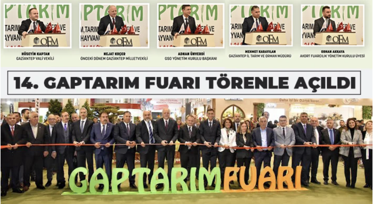 Tarım ve Orman Bakanlığı himayesinde, Gaziantep Sanayi Odası (GSO) ve Akort Fuarcılık iş birliğinde; Gaziantep Büyükşehir Belediyesi, Gaziantep Ticaret Borsası (GTB), Gaziantep İl Tarım ve Orman Müdürlüğü, Gaziantep Ziraat Odası ve KOSGEB destekleri ile organize edilen, 14. GAPTARIM Fuarı, Ortadoğu Fuar Merkezi’nde (OFM) ziyaretçilere açıldı. Açılış törenine, Gaziantep Vali Vekili Hüseyin Kaptan, önceki dönem Gaziantep Milletvekili Nejat Koçer, Gaziantep Büyükşehir Belediye Başkan Vekili Erdem Güzelbey, Dışişleri Bakanlığı Gaziantep Temsilcisi Büyükelçi Hakkı Emre Yunt, Şehitkamil Kaymakamı Ömer Hilmi Yamlı, Gaziantep Sanayi Odası Yönetim Kurulu Başkanı Adnan Ünverdi ve Yönetim Kurulu Üyeleri, Gaziantep Ticaret Borsası (GTB) Yönetim Kurulu Başkan Yardımcısı Enver Çokay, Gaziantep İl Tarım ve Orman Müdürü Mehmet Karayılan, KOSGEB Gaziantep İl Müdürü Muhammed Paksoy, Akort Fuarcılık Yönetim Kurulu Başkanı Hülya Akkaya, GSO Genel Sekreteri Yusuf İymen, kurum müdürleri ve protokol üyeleri katıldı.