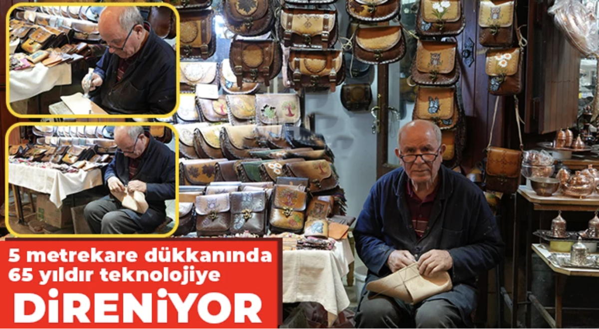 Gaziantep’te Bakırcılar Çarşısı’ndaki 5 metrekare dükkanında 65 yıldır dede mesleğini yaşatmaya çalışan 75 yaşındaki Tahir Demirci, el yapımı çanta yapıp satarak teknolojiye direniyor.