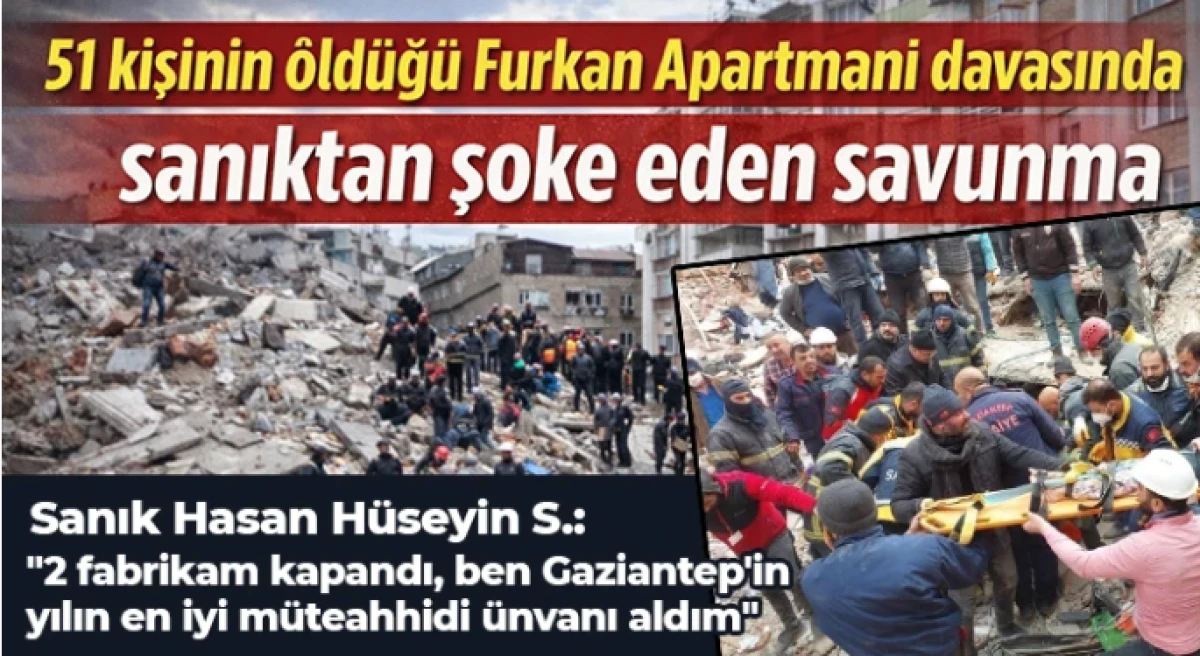 Gaziantep'in Nizip ilçesinde, Kahramanmaraş merkezli 6 Şubat depremlerinde yıkılan ve 51 kişinin ölümüne neden olan Furkan Apartmanı davasında firari sanık Hasan Hüseyin S., ilk kez hakim karşısına çıktı. Sanık Hasan Hüseyin S., "6 Şubat depremlerinden sonra 2 fabrikam kapandı. Yüzlerce işçi çıkarmak zorunda kaldım. Ben Gaziantep'in yılın en iyi müteahhidi ünvanı aldım" dedi.