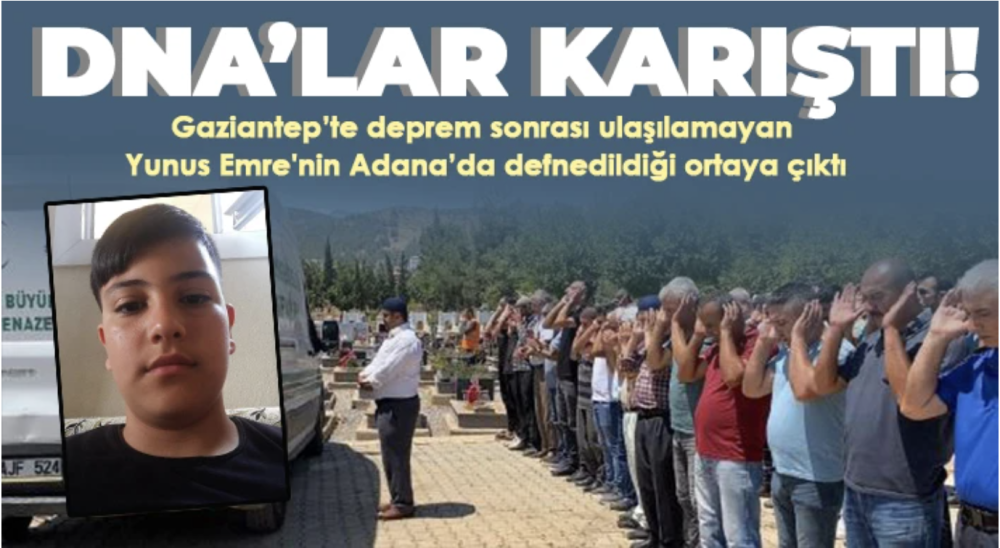 Kahramanmaraş merkezli depremlerin vurduğu Gaziantep'in İslahiye ilçesinde, yıkılan binanın enkazında yaşamını yitiren Yunus Emre Tunçbilek’in (14), DNA testiyle cenazesinin karışıp Adana'ya defnedildiği belirlendi. Yunus Emre'nin cenazesi, Adana'daki mezardan çıkarılıp İslahiye'de, annesi ve kardeşinin yanına defnedildi.