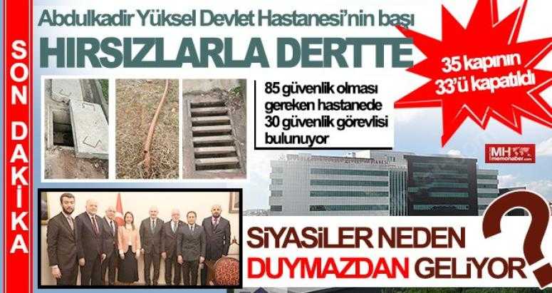 "Dört yıl önce yapımı tamamlanan ve henüz yüzde 50 kapasite ile faaliyetlerini sürdüren Abdulkadir Yüksel Devlet Hastanesi’nin başı hırsızlarla dertte. Hastanenin MR cihazının soğutma ünitesini dahi çalan hırsızlar hastane çevresindeki mazgalları şu ana kadar 8 defa çaldı. "