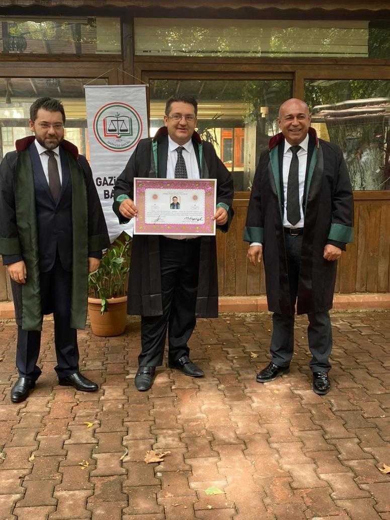 Stajını tamamlayan Gaziantep Barosu Avukatlarından Mustafa Bülent Acıoğlu’na cübbesini kardeşi Halil Emre Acıoğlu giydirdi.