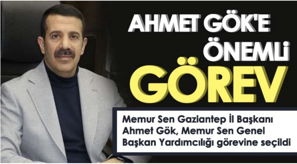 Memur Sen 7. Olağan Genel Kurulu, 1 Mayıs 2023 tarihinde Cumhurbaşkanı Recep Tayyip Erdoğan'ın katılımıyla yapıldı. Genel kurulun ardından mevcut başkan Ali Yalçın güven tazeleyerek tekrar başkan seçildi. Gaziantep'te önemli işler yapan ve önemli başarılara imza atan Memur Sen Gaziantep İl Başkanı Ahmet Gök'e ise Memur Sen Genel Başkan Yardımcılığı görevi tevdi edildi. Genel başkan yardımcılığı görevi tevdi edilen Memur Sen Gaziantep İl Başkanı Ahmet Gök, "1 Mayıs'ta anlamlı bir şekilde kutladığımız Memur-Sen 7. Olağan Genel Kurulumuzu Cumhurbaşkanımız Sayın Recep Tayyip Erdoğan beyefendinin teşrifleriyle gerçekleştirdik. Güven tazeleyen Genel Başkanımız Sayın Ali Yalçın beyefendiye Memur-Sen Genel Merkez Yönetim Kurulunda şahsıma Genel Başkan yardımcılığı görevini tevdi edişinden dolayı teşekkür ediyor, ömür boyu başarı ve mutluluklar diliyorum. Rabbim bizi kendi yolundan ayırmasın ve iki cihanda da mahçup eylemesin inşallah" ifadelerini kullandı.