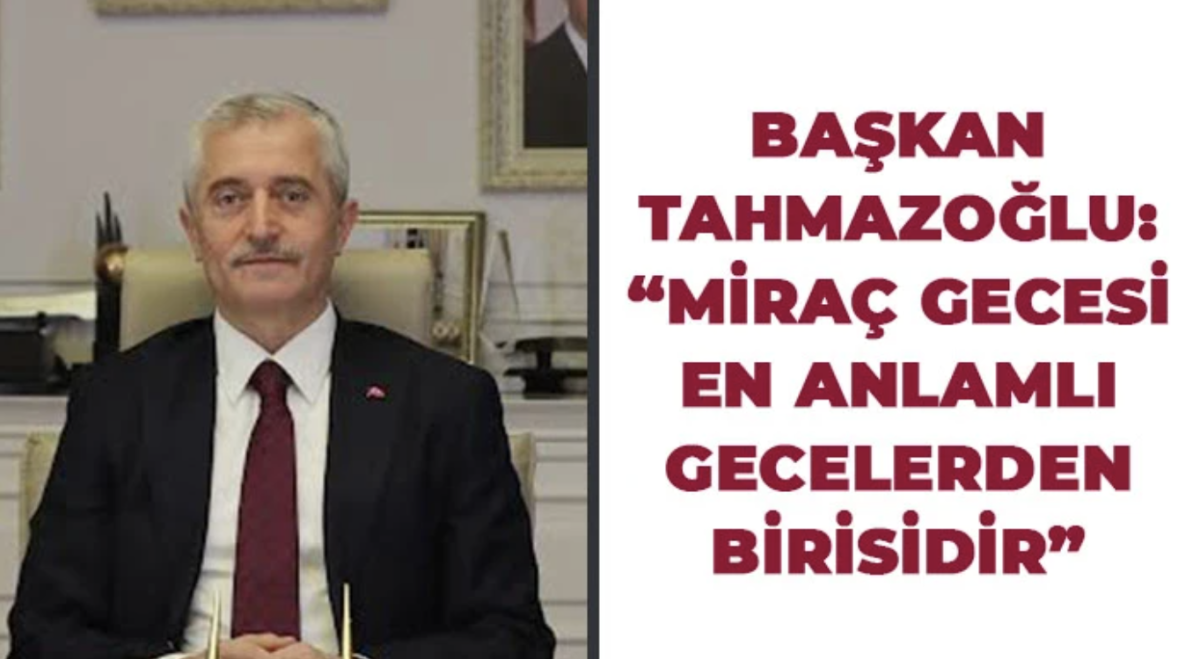 Başkan Mehmet Tahmazoğlu mesajında, "Miraç gecesi; sevgili Peygamberimizin, bir gece Mescid-i Haram'dan, Yüce Allah'ın ayetlerinin gösterilmesi için, çevresi mübarek kılınan Mescid-i Aksa'ya götürülmesi, oradan da zaman ve mekân unsurlarının aşıldığı bir makama ulaştırılması olayının cereyan ettiği gecedir. Bu geceler, kendimizi ve yaptıklarımızı bir kez daha gözden geçirmek ve sorumluluklarımızı hatırlamak bakımından bir fırsat olarak düşünülmelidir. Dolayısıyla, Miraç Gecesi de bu anlayışla değerlendirilmeli, anlam ve ruhuna uygun olarak, toplumsal huzur ve barışı sağlamaya yönelik gayretler sürekli artırılmalıdır. Bu duygu ve düşüncelerle; tüm vatandaşlarımızın Miraç Gecesini tebrik ediyor, bu gecenin tüm insanlığın huzur ve barışına vesile olmasını Cenab-ı Hak'tan niyaz ediyorum" dedi