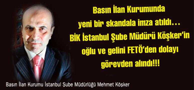 İçişleri Bakanlığı bünyesinde görev yaparken 15 Temmuz hain darbe girişiminin ardından görevden alınan karı ve koca Basın İlan Kurumunun İstanbul Şube Müdürü Mehmet Köşker’in oğlu ve gelini çıktı. Basın İlan Kurumu’nda yıllardır örümcek ağı gibi hareket eden FETÖ’cüler tartışma konusu olurken, ortaya çıkan bu son skandal yaşananların tuzu biberi oldu. FETÖ Çatı Davasının önemli sanıkları arasında yer alan BİK eski Yönetim Kurulu Üyesi Alaaddin Kaya, kurum içerisinde FETÖ bağlantılı onlarca olayın aydınlatılmasında önemli rol oynamıştı. Çatı davası devam ederken BİK içerisinde ki FETÖ’cü teşkilatlanma defalarca haberlere konu oldu. Basın İlan Kurumu içerisinde ki ihanetçi guruba yönelik her hangi bir adım atılmazken yaşanan bu son olay akıllara, “bu adamları kim veya kimler koruyor” sorusunu getiriyor.