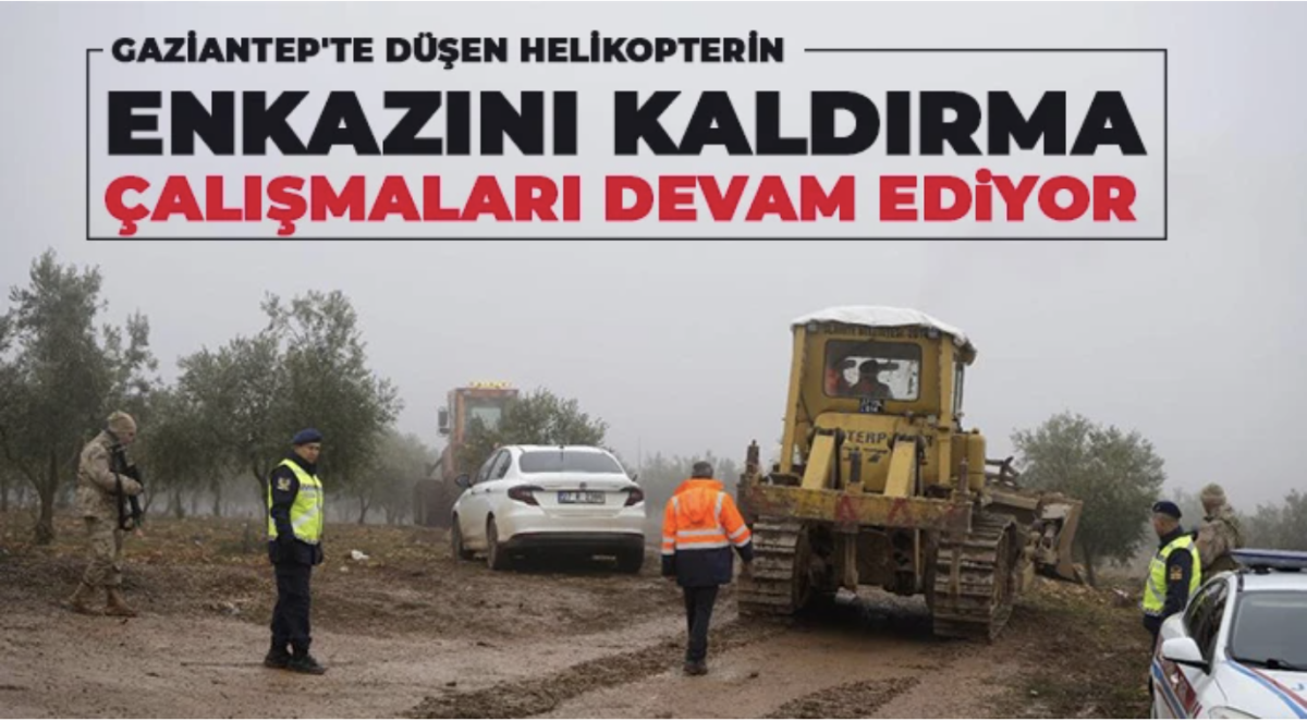 Hatay Havalimanı’ndan havalandıktan sonra Gaziantep’in Nurdağı ilçesi kırsalında kaza kırıma uğrayan polis helikopterinin enkazını kaldırma çalışmaları devam ediyor.
