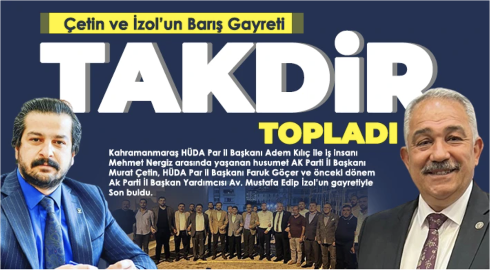 Kahramanmaraş HÜDA Par il Başkanı Adem Kılıç ile iş insanı Mehmet Nergiz arasında yaşanan husumet AK Parti İl Başkanı Murat Çetin, HÜDA Par il Başkanı Faruk Göçer ve önceki dönem Ak Parti İl Başkan Yardımcısı Av. Mustafa Edip İzol’un gayretiyle son buldu.