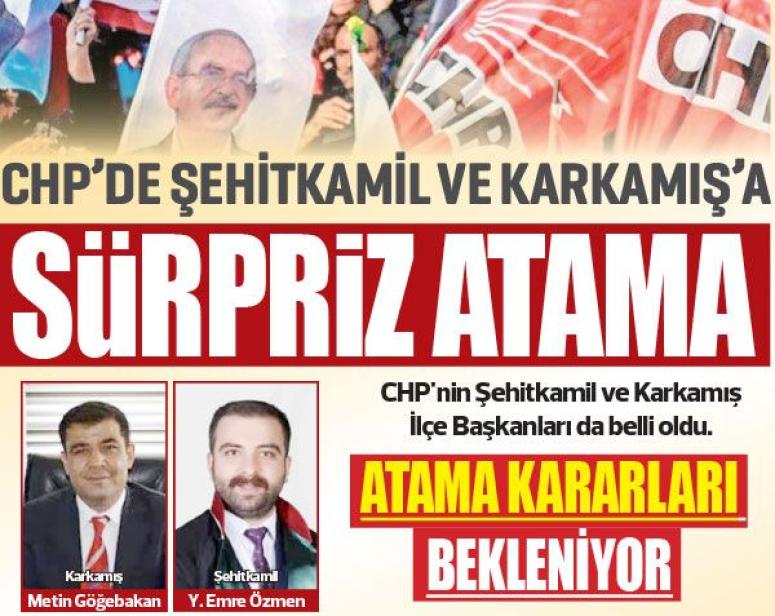 Buna göre CHP Şehitkamil İlçe Başkanlığına Av. Yunus Emre Özmen, Karkamış İlçe Başkanlığına da Metin Göğebakan'ın atanması kesinleşti. CHP Genel Merkezi'nin iki ilçe başkanı ile ilgili atama kararını önümüzdeki günlerde Gaziantep İl Başkanlığına göndermesi bekleniyor.