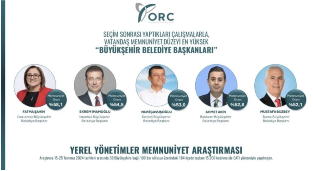 ORC Araştırma Şirketi'nin 15-25 Temmuz 2024 tarihleri arasında gerçekleştirdiği yerel yönetimler memnuniyet araştırması sonuçlandı. Araştırma, 30 büyükşehirde 100 bin nüfusun üzerindeki 184 ilçede toplam 15.200 katılımcıyla yapıldı. Gaziantep Büyükşehir Belediye Başkanı Fatma Şahin, vatandaş memnuniyeti düzeyi en yüksek büyükşehir belediye başkanı olarak öne çıktı. Fatma Şahin, Türkiye'nin en beğenilen büyükşehir belediye başkanı seçildi Araştırma sonuçlarına göre Başkan Fatma Şahin, yüzde 58,1 memnuniyet oranıyla listenin zirvesinde yer aldı. Şahin'in ardından İstanbul Büyükşehir Belediye Başkanı Ekrem İmamoğlu yüzde 54,5 memnuniyet oranıyla ikinci, Denizli Büyükşehir Belediye Başkanı Nuri Çavuşoğlu yüzde 53,0 oranıyla üçüncü, Balıkesir Büyükşehir Belediye Başkanı Ahmet Akın yüzde 52,8 ile dördüncü ve Bursa Büyükşehir Belediye Başkanı Mustafa Bozbey yüzde 52,1 ile beşinci sırada yer aldı. Halkın büyük takdirini kazandı Başkan Fatma Şahin'in, Gaziantep'te yürüttüğü başarılı projeler ve vatandaş odaklı yönetim anlayışı, halkın büyük takdirini kazandı. Şahin, göreve geldiği günden bu yana altyapı geliştirme, sosyal hizmetler ve çevre projeleri gibi birçok alanda önemli adımlar attı. Bu çalışmaların neticesinde Gaziantep halkının memnuniyet oranının yüksek olması dikkat çekiyor. ORC Araştırma'nın gerçekleştirdiği bu çalışma, yerel yönetimlerin vatandaş nezdindeki performanslarını değerlendirmek açısından önemli bir gösterge olarak kabul ediliyor. Bu sonuçlar, belediye başkanlarının gelecek çalışmalarında da yol gösterici olmayı amaçlıyor.