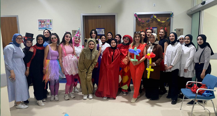 Ziyarette bazı öğrenciler palyaço kıyafeti giyerken, bazıları da yüzünü boyayıp gösteri yapıp, çocuk hastalarla birlikte oyun oynadı.