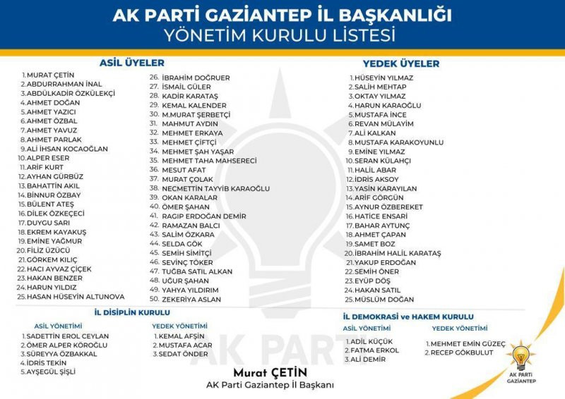 AK Parti Gaziantep İl yönetimi belli oldu. Son yönetim kurulunun yüzde 80'i değişti. Bir birinden ilginç isimler var. AK Parti Genel Başkanı ve Cumhurbaşkanı Recep Tayyip Erdoğan tarafından AK Parti Gaziantep İl Başkanı olarak atanan Murat Çetin'in birlikte görev yapacağı yönetim kurulu listesi için geri sayıma geçildiğini www.memohaber.com duyurmuştu. AK Parti Bölge Koordinatörü Hakan Kahtalı ile birlikte il başkanı son şeklini verdiği listeyi deklare ederek Ankara'ya döndü. AK Partinin en son listesinde yer alan 50 Kişilik yönetim kurulundan sadece 11 kişi listede yerini korurken 39 kişi liste dışı kaldı. İl Başkanı Murat Çetin yeni yönetim kurulunu oluşturduktan sonra yaptığı yazılı açıklamasında; Yeni yönetim kurulumuzu oluştururken, şehrimizin demografik yapısı ve mesleki dağılımı titizlikle göz önünde bulundurularak gençlerimiz ve kadınlarımız geleceğin teminatı ve toplumsal dönüşümde öncü güç olarak kabul edilmiştir" dedi. Başkan Çetin'in açıklaması şöyle; Cumhurbaşkanımız Sayın Recep Tayyip Erdoğan'ın tensipleriyle 07.07.2023 tarihinde il başkanlığı görevi şahsıma tevdi edildi. Bu kutlu davada görev almak isteyen ve partimize gönül vermiş hemşehrilerimiz tarafından yönetim kurulu üyeliği için büyük bir teveccüh gösterildi. Yeni yönetim kurulumuz oluşturulurken, şehrimizin demografik yapısı ve mesleki dağılımı titizlikle göz önünde bulundurularak , gençlerimiz ve kadınlarımız geleceğin teminatı ve toplumsal dönüşümde öncü güç olarak kabul edilmiş, onların katılımına da önem verilmiştir. Yönetim kurulumuzu belirlemek için ilimizde yaptığımız istişareler neticesinde; 2002 ruhuyla, ilk günkü aşk ve heyecanla “Türkiye Yüzyılı”na yakışır yönetim kurulumuzu, il disiplin kurulumuzu ve il demokrasi ve hakem kurullarımızı belirlemiş bulunmaktayız. Devraldığımız bayrağı daha da yükseklere taşımak için var gücümüzle çalışacağız. Cumhurbaşkanımız Sayın Recep Tayyip ERDOĞAN'dan aldığımız talimat doğrultusunda; bu kadromuzla çalmadık kapı, sıkılmadık el bırakmadan tüm kademelerimizle ve yerel yöneticilerimizle uyum içerisinde 31 Mart 2024 yerel seçimleri için çalışmalara bugünden itibaren başlamış bulunmaktayız. Sayın Cumhurbaşkanımız Recep Tayyip ERDOĞAN başta olmak üzere Genel başkan yardımcımız AK Parti teşkilat başkanımız Sayın Erkan Kandemir'e Güneydoğu Anadolu Bölge Teşkilat Başkanımız Sn. Abdullah Ağralı'ya İl Koordinatörümüz , önceki dönem Malatya Milletvekilimiz Sn. Hakan Kahtalı'ya ve tüm AK PARTİ teşkilatımıza, yeni yönetimimizde görev alan - almayan tüm dava arkadaşlarımıza şükranlarımı sunarım. Yeni yönetim kurullarımızın şehrimize ve teşkilatımıza hayırlı olmasını dilerim. İŞTE AK PARTİ GAZİANTEP'İN YENİ YÖNETİM KURULU LİSTESİ: