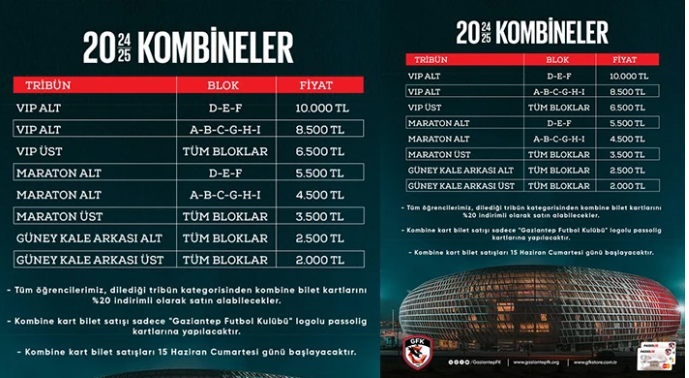 Gaziantep Futbol Kulübü'nün, 2024-2025 Süper Lig ve Ziraat Türkiye Kupası’nda oynayacağı karşılaşmalarda geçerli olacak olan sezonluk kombine bilet fiyatları belli oldu.