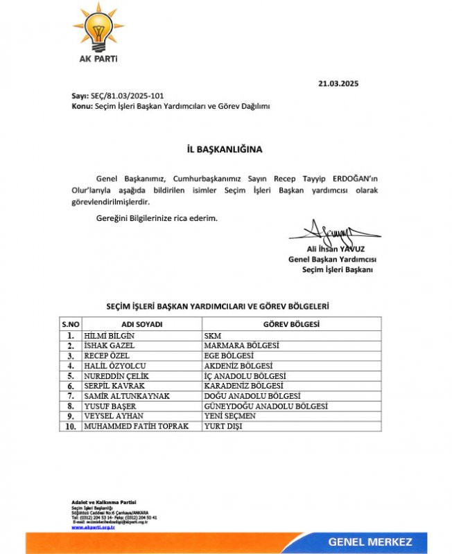 Yeni görevlendirme kapsamında Güneydoğu Anadolu Bölgesi Seçim İşleri Başkan Yardımcısı görevine ise Yusuf Başer atandı. Kararı sosyal medya hesabından duyuran AK Parti Gaziantep İl Başkanı Fatih Muhaddis Fedaioğlu yaptığı açıklamada, "Cumhurbaşkanımız Sayın Recep Tayyip Erdoğan’ın onayıyla, Sayın Ali İhsan Yavuz’un başkanlığını yaptığı AK Parti Seçim İşleri Başkan Yardımcılığı görevine getirilen ve aynı zamanda Karadeniz Bölge Sorumluluğu görevini üstlenen Serpil Kavrak Hanımefendi’yi tebrik ediyorum. Kendisi, partimize olan bağlılığı ve başarılarıyla bu önemli görevde de büyük bir sorumluluk taşıyacak. Yeni görevinde gösterdiği özveri ve gayretle, partimizin hedeflerine ulaşmasında önemli katkılar sağlayacağına inanıyorum. Allah, başarılarını daim etsin" bilgisine yer verdi.
