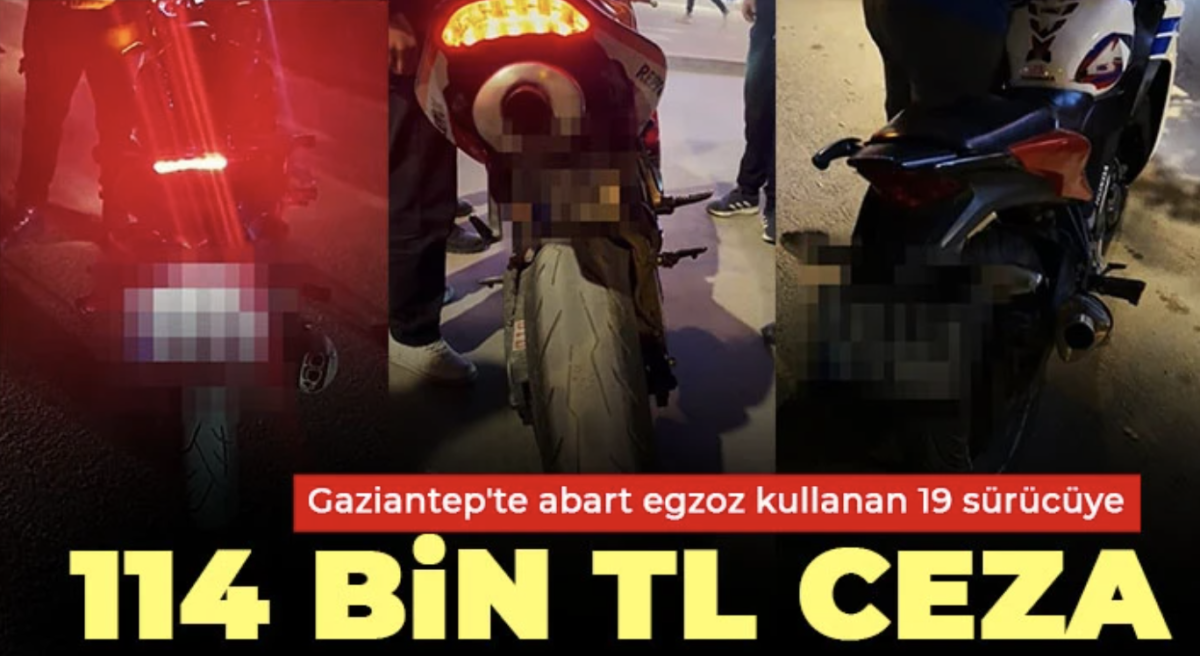 Gaziantep'te çevreyi rahatsız edecek şekilde gürültü çıkaran ve abart egzoz kullanan 19 motosiklet sürücüsüne 114 bin 577 TL cezai işlem uygulandı.
