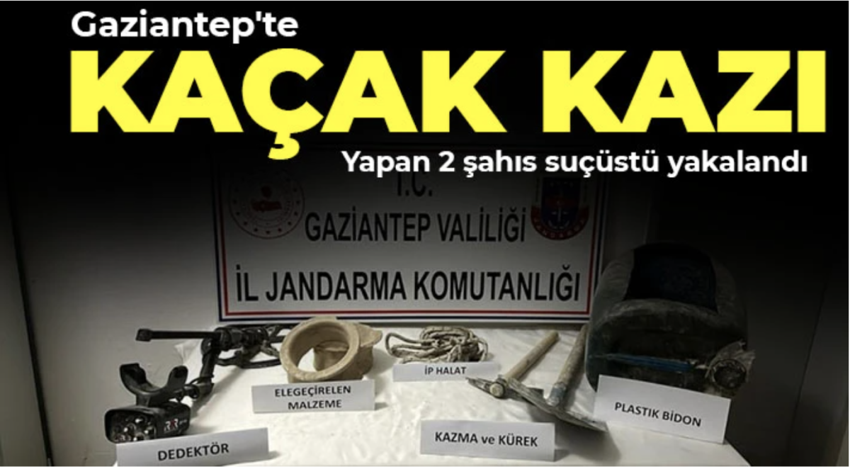 Gaziantep'te İl Jandarma Komutanlığı ekipleri ve adli makamların koordinesiyle tarihi eser kaçakçılığının önlenmesine yönelik çalışma yapıldı. Çalışmalar çerçevesinde Nizip ilçesinde icra edilen önleyici kolluk devriyesi esnasında mağara içerisinde define bulmak amacıyla izinsiz kazı yaptığı tespit edilen A.K. ve K.K. isimli şüpheliler suçta kullandıkları dedektör ve kazı malzemeleri ile birlikte suçüstü yakalandı. Suçta kullanılan dedektör ve kazı malzemelerine el konularak şüpheli şahıslar hakkında yasal işlem başlatıldı.