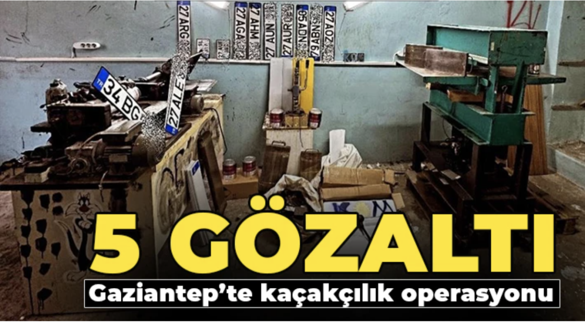 Gaziantep İl Emniyet Müdürlüğüne bağlı Kaçakçılık ve Organize Suçlarla Mücadele ekipleri, Cumhuriyet Başsavcılığı koordinesinde 3 işyeri ve 2 depoda operasyon düzenledi. Yapılan operasyonda, 180 adet basılı plaka, 722 adet boş plaka levhası, 500 adet harf ve rakam kalıbı, 80 adet plakalık, 33 adet metal baskı kalıbı, 4 adet plaka boya makinesi, 1 adet mühür makinesi ve taklit mühür, 3 adet motor markasını değiştirmeye yarayan mühür, 1 adet plaka basım pres makinesi ele geçirildi. Gözaltına alınan 5 şüpheli hakkında yasal işlem başlatıldı.