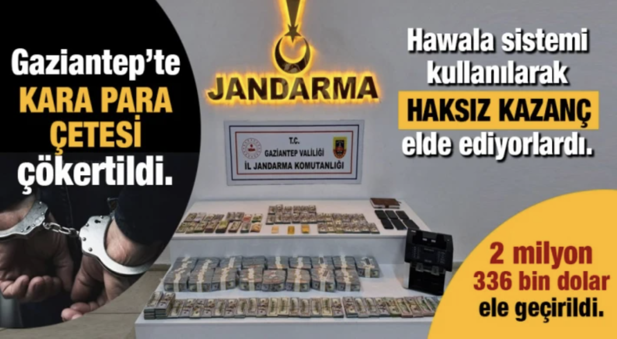 Gaziantep Jandarma, “Havala” yöntemi ile kara para aklayan çeteye baskın yaptı. Baskında 2 milyon 336 bin 773 dolar, külçe altın ve çok sayıda para ele geçirildi. Gaziantep İl Jandarma Komutanlığı ekipleri, kaçakçılıkla mücadeleye yönelik Cumhuriyet Başsavcılığı koordinesinde çalışma yaptı. Yapılan çalışmalar neticesinde, Şehitkâmil ilçesinde danışmanlık hizmeti adı altında faaliyet gösteren bir işyerinde yüksek miktarda döviz ve altın bulundurulduğu bilgisi alan ekipler, titiz planlama, teknik ve fiziki takip çalışmaları sonucunda yasadışı ve kayıtdışı para transferi yöntemi olan “HAWALA” sistemi kullanarak haksız kazanç elde eden (M.A), (S.B), (M.A), (A.B), (C.H), (M.A), (A.İ) isimli 6 şüpheli şahsa operasyon yaptı. Yapılan operasyonda şüpheliler yakalanarak gözaltına alındı. Diğer yandan 2 ayrı işyerinde, şüphelilerin üstünde ve araçlarında yapılan aramalarda ise 2 milyon 336 bin 773 ABD Doları, 6 bin 30 Euro, 9 bin 870 Türk Lirası, 31 bin 256 Suudi Arabistan Riyalı, 1 kilogram külçe altın ve 348 gram hurda altın ele geçirildi ve işyeri kamera kayıtları, 1 ajanda, 1 para sayma makinesi ile 6 adet cep telefonuna el konuldu. Gözaltına alınan şüphelilerin tamamı işlemlerinin ardından çıkarıldıkları adli makamlarca tutuklanarak cezaevine teslim edildi.