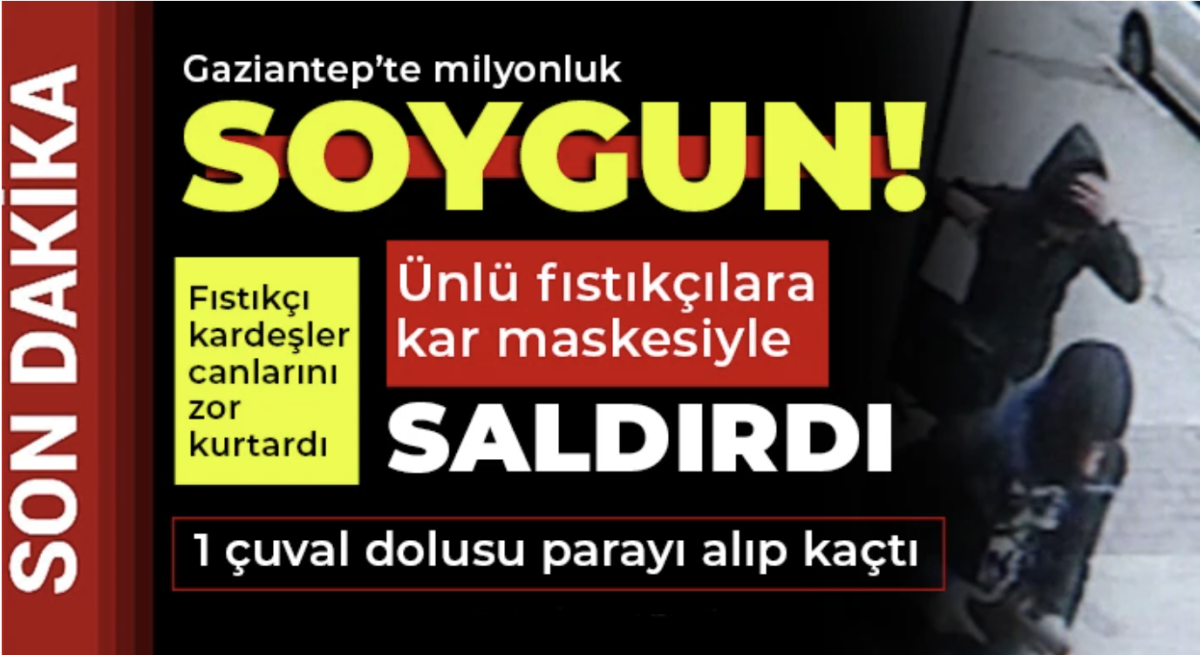 Gaziantep’in Şehitkamil ilçesindeki GATEM Toptancılar Sitesi’nde meydana gelen olayda, fıstık ticareti yapan R.T ve İ.T. kardeşler iş yerlerinin yakınındaki banka şubesinden 3 milyon lira çekip bankadan çıktı. Kardeşlerden İ.T. yakındaki döviz bürosuna gidip paranın bir kısmıyla döviz alıp aracına döndü. Kardeşler araçlarıyla hareket etmeye çalışırken araca yaklaşan kar maskeli bir kişi cama silah doğrultarak kapıyı açmalarını istedi. Fıstıkçı kardeşler araçlarını hareket ettirirken maskeli şahıs araca ateş açtı. Silahtan çıkan mermiler koltuğa isabet ederken sürücü koltuğundaki kardeşlerden biri kendisini araçtan atarken saldırgan da kapıyı açıp 2 naylon çuval içindeki parayı almak istedi. Naylon torbalardan biri yırtılınca gaspçı sağlam olanını alarak kayıplara karıştı. İhbar üzerine Gaziantep Emniyet Müdürlüğü Gasp Bürosu ekipleri olay yerine gelerek araçta inceleme yaptı. Bölgedeki güvenlik kamerası görüntüleri de inceleyen polis saldırganları yakalamak için çalışma başlattı.