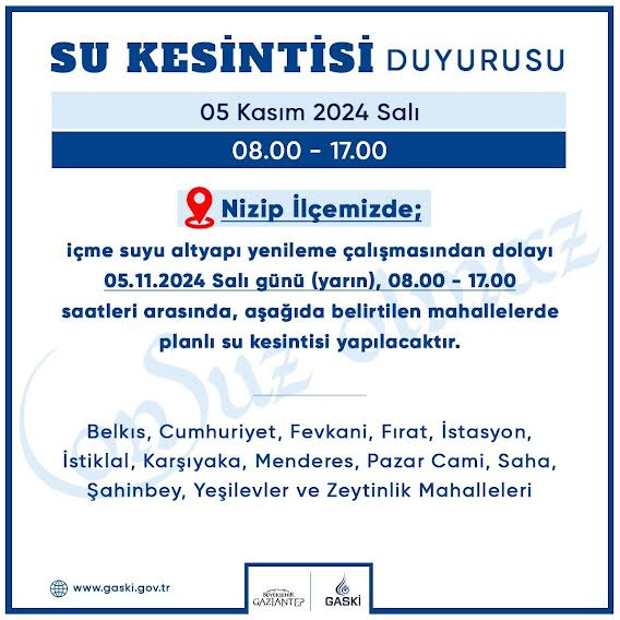 Gaziantep Su ve Kanalizasyon İdaresi (GASKİ) tarafından Nizip ilçesinde yürütülen içme suyu altyapı yenileme çalışmaları nedeniyle 05 Kasım Salı günü (Yarın) 08.00 ile 17.00 saatleri arasında bazı mahallelerde su kesintisi yaşanacak.