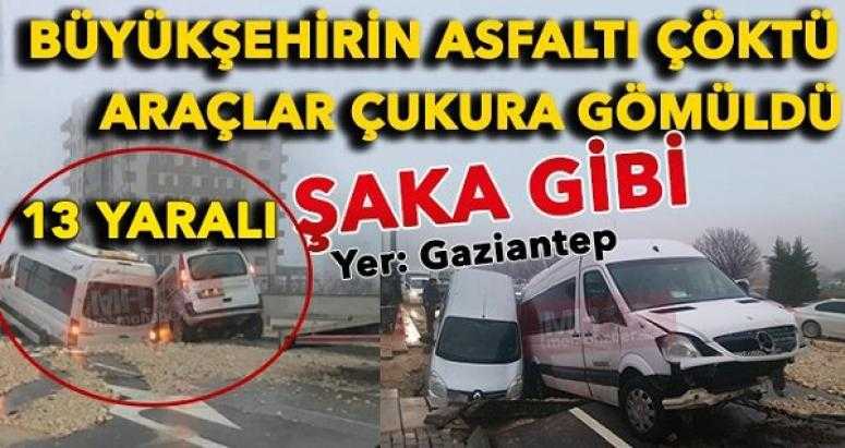 Edinilen bilgiye göre, Şehitkamil ilçesi Fıstıklı Mahallesi Turgut Özal Bulvarı Yeni Stat kavşağında yolda çökme meydana geldi. Açılan dev çukura, biri işçi servis minibüsü olmak üzere 2 araç düştü. Araçlarda bulunan 13 kişi hafif şekilde yaralandı. Yaralılardan 2'si Gaziantep'teki hastanelere kaldırılırken, diğerlerinde hafif sıyrıklar olduğu öğrenildi. Olayda can kaybının olmaması sevindirirken facianın eşiğinden dönüldü.