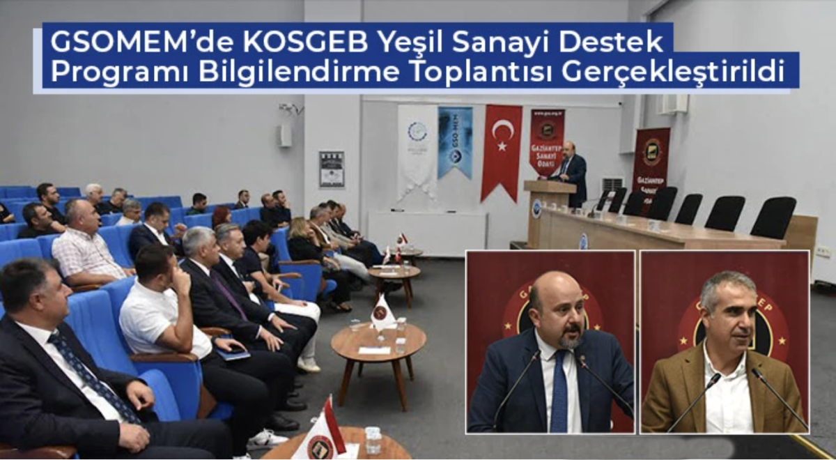 Gaziantep Sanayi Odası (GSO) ile Küçük ve Orta Ölçekli İşletmeleri Geliştirme ve Destekleme İdaresi Başkanlığı (KOSGEB) iş birliğinde, ‘’Yeşil Sanayi Destek Programı’’ ve AB Yeşil Mutabakatı kapsamında ‘’İşletmeleri Bekleyen Değişimler ile Yeşil Dönüşümün Verimliliğe ve Rekabete Etkisi’’ konulu bilgilendirme toplantısı Gaziantep Sanayi Odası Mesleki Eğitim Merkezi’nde (GSOMEM) gerçekleştirildi.