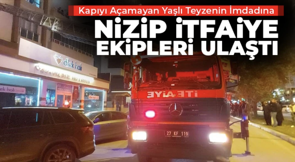 Nizip'te, Fatih Sultan Mahallesi’nde 80 yaşındaki yaşlı bir kadının evinde yalnız kaldığı sırada kapıyı açamaması nedeniyle zor durumda kalması sonucu Nizip İtfaiye Ekipleri devreye girdi. Olay, yaşlı kadının kızı tarafından ihbar edilmesiyle ortaya çıktı. Kızı, annesinin evine geldiğinde kapıyı açmadığını fark edince hemen 112 Acil Servis ve Nizip İtfaiye Müdürlüğü’ne haber verdi.