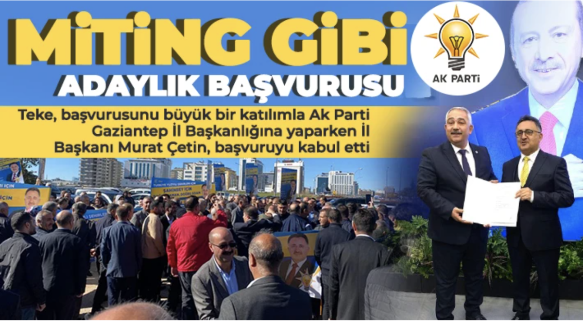 Şahinbey Belediye Başkanlığı için aday adayı olan Hasan Teke, daha sonra Ak Parti Gaziantep İl Başkanı Murat Çetin ile bir araya gelerek aday adaylığı başvurusunu yaptı. Ak Parti İl Binasına akın eden yüzlerce partili ise “Hasan Teke gelecek, dertler bitecek” Tezahüratlarıyla yer aldılar.