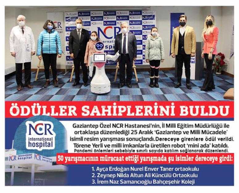 Gaziantep Özel NCR Hastanesi’nin, İl Milli Eğitim Müdürlüğü ile işbirliği halinde düzenlediği 25 Aralık ‘Gaziantep ve Milli Mücadele' isimli resim yarışması sonuçlandı. Şehitkamil İlçe Milli Eğitim Müdürü Mehmet Yağcı'nın katılımlarıyla. Dereceye girenlere ödülü verildi. Yerli ve milli imkanlarla üretilen robot ‘mini ada’ nında katıldığı törene pandemi tedbirleri kapsamında sınırlı katılımcı alındı.