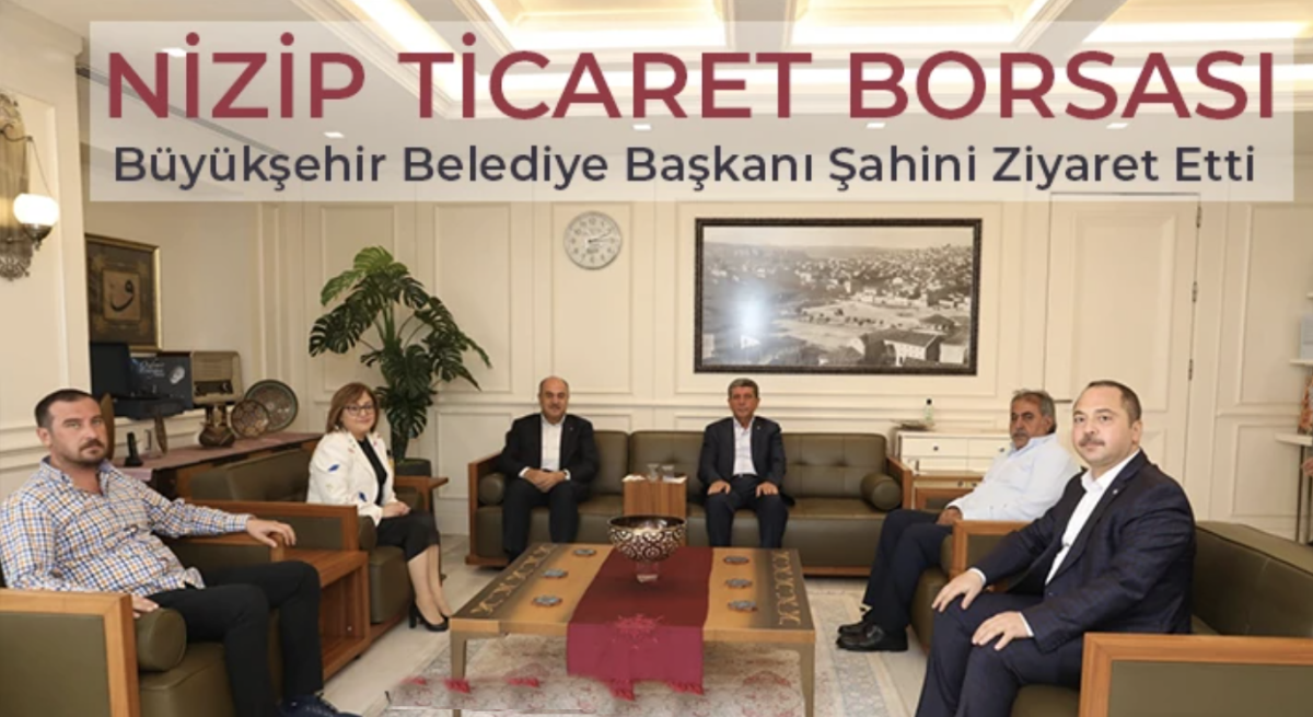 Nizip Ticaret Borsası (NTB) Yönetim Kurulu Başkanı İbrahim Sarı, NTB Meclis Başkanı Ahmet Polat, NTB Yönetim Kurulu Başkan Yrd. Harun Aslan, NTB Yönetim Kurulu Üyesi Kemal Çetinkaya ve NTB Genel Sekreteri M. Eray Ölçal Gaziantep Büyükşehir Belediye Başkanı Fatma Şahin’i makamında ziyaret etti.