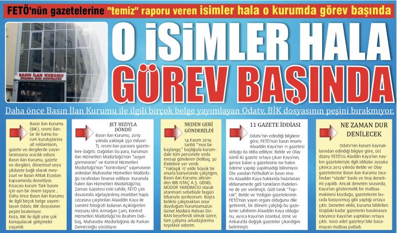 Odatv'nin kurum kaynaklarından edindiği bilgiye göre, üst düzey FETÖ’cü Aladdin Kaya’nın naylon gazeteleriyle ilgili iddialar ayyuka çıkınca 2012 yılında Belde ve Olay gazetelerine Basın İlan Kurumu tarafından "sözde" baskı ve tiraj denetimi yapıldı. Ancak denetim sırasında, Kaya’nın göstermelik bir matbaa makinesi koyduğu, gazetelerini burada basıyormuş gibi yaptığı ortaya çıktı. Denetim ekibi, kuruma bildirilen tirajdaki kadar gazetenin basılmasını isteyince Kaya’nın yaptıkları ortaya çıktı. 1000 adet gazeteyi bile basamayan matbaa patladı. Çevre matbaalarda zar zor basılan gazetelerin de sabah saatlerinde hurda kâğıt olarak satıldığı tespit edildi. Kaya’nın gazetelerinin her şeyi sahte çıkmış ve tutanak altına alınmıştı, ancak iddiaya göre, devreye giren Basın İlan Kurumu yönetimi, bu tutanaklara müdahale etti. Hazırlanan tutanakla, tüm bu olanlar yaşanmamış, Kaya’nın gazeteleri normalmiş gibi gösterildiği ileri sürüldü. Kaya’nın patlayan matbaasını ve ortaya çıkanları ise BİK Kontrol Hizmetleri Müdürlüğü kapattı. BİK Hizmetleri Müdürü İbrahim Delibaş, tüm iddialara rağmen Kontrol Müdürlüğü koltuğunda oturmaya devam ederken, yardımcılığı ise yıllık ortalama 550 milyon TL’nin dağıtımını yöneten BİK Kontrol Hizmetleri Müdür Yardımcısı Mehtap Uğur yapıyor. 2 yıllık önlisans mezunu, İstanbul Gedikpaşa’daki cami imamı Abdurrahman Uğur’un kızı Mehtap Uğur’un müstahdemlikten gelen önlemeyen yükselişini de Odatv ortaya çıkarmıştı.