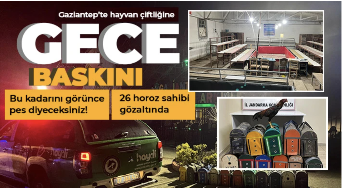 Gaziantep jandarma ekipleri gece bir çiftliğe düzenledikleri baskında 26 kişiyi kumar oynattıları gerekçesiyle gözaltına alındılar. Çiftlikte bulunan horozlara el konuldu.