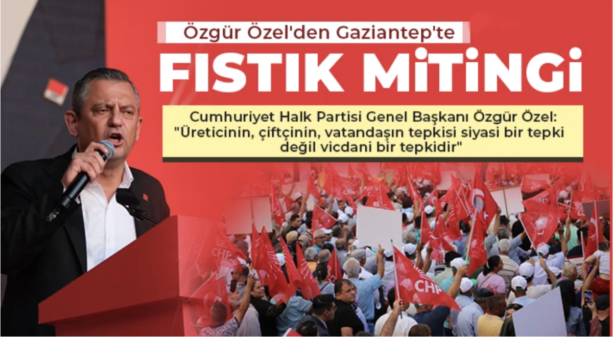 CHP Genel Başkanı Özgür Özel, Gaziantep'te partisinin düzenlediği Fıstık Mitingi'ne katıldı. CHP Genel Başkanı Özgür Özel, partisinin Gaziantep'te 'Üreticinin Sesini Duyuruyoruz' sloganıyla düzenlediği Fıstık Mitingi'ne katıldı. Özel, İstasyon Meydanı'nda gerçekleştirilen mitingde fıstık üreticisi olan çiftçilere ve vatandaşlara seslendi.