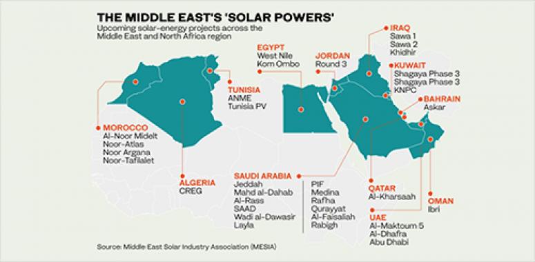 Ortadoğu ve Kuzey Afrika bölgesindeki güneş enerjisi projelerinin değerinin 5 milyar ila 7,5 milyar dolar arasında olduğu tahmin ediliyor. 2024 yılına gelindiğinde ise bu rakamın 15 milyar dolardan 20 milyar dolara çıkması bekleniyor.