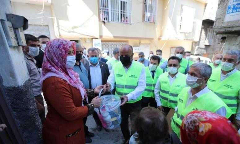 Şahinbey Belediye Başkanı Mehmet Tahmazoğlu, AK Parti Gaziantep Milletvekili Mehmet Sait Kirazoğlu, AK Parti Şahinbey İlçe Başkanı Hasan Teke ve Çevre ve Şehircilik İl Müdürü Hasan Alan ile bilirlikte Yukarıbayır Mahallesi’nde mahallelerde evleri ziyaret ederek temizlik seti hediye ettiler.