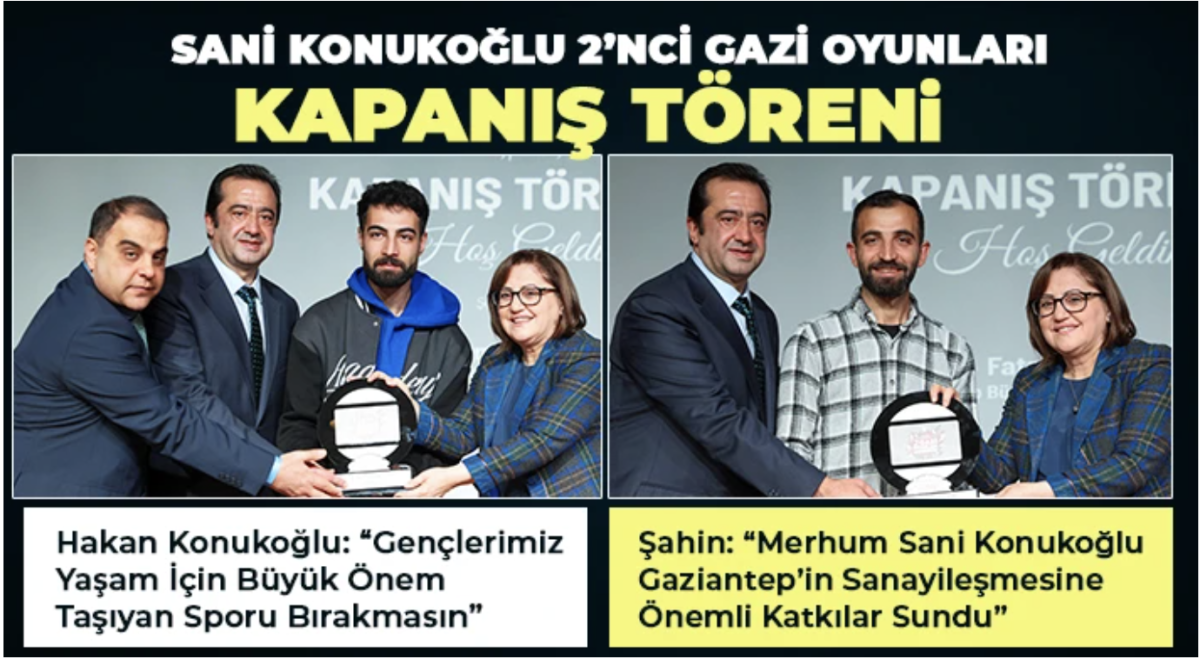 Konukoğlu, “2’nci Gazi Oyunları’nın rahmetli babam Sani Bey adına düzenleyen Büyükşehir Belediye Başkanımız Fatma Şahin’in şahsında bu anlamlı organizasyona emek verip katkı sunan herkese ailem adına teşekkür ediyor, mücadele eden tüm sporcularımızı tebrik ediyorum” diyerek sözlerini tamamladı. 25 Aralık Gaziantep Savunması Kahramanlık Panoraması ve Müzesi’nde düzenlenen 2’nci Gazi Oyunları kapanış törenine Büyükşehir Belediye Başkan Vekili Mehmet Berk, Gaziantep İl Milli Eğitim Müdürü Yasin Tepe, Gaziantep Gençlik ve Spor İl Müdürü Mustafa Ertunç, spor dalı il temsilcileri, sporcular ve davetliler katıldı. Gazi Oyunlarının 1’incisi Galatasaray Başkanı merhum Mustafa Cengiz anısına düzenlenmişti.