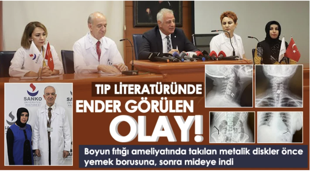Boyun fıtığı ameliyatı ile omurlara takılan metalik disklerin önce yemek borusuna, daha sonra mideye inmesi nedeniyle ölümle burun buruna gelen hasta, SANKO Üniversitesi Hastanesi’nde gerçekleştirilen başarılı operasyonla sağlığına kavuştu. Hasta ve tedaviyi gerçekleştiren ekibin katılımı ile düzenlenen bilgilendirme toplantısında konuşan SANKO Üniversitesi Tıp Fakültesi Dekanı Prof. Dr. Salih Murat Akkın, “Hastanemiz tüm branşlarda üst düzey sağlık hizmeti sunuyor” dedi. Vakayı, “Çok ender görülen karmaşık süreçli” olarak tanımlayan Prof. Dr. Akkın, “Süreci doğru yöneterek sonuçlandıran ülkemizin önemli göğüs cerrahlarından Prof. Dr. Levent Elbeyli’nin liderliğinde İç Hastalıkları Ana Bilim Dalı Gastroenteroloji Bölümümüzden Doç. Dr. Nimet Yılmaz ile Anesteziyoloji ve Reanimasyon Ana Bilim Dalımız adına Doç. Dr. Betül Şimşek’le birlikteyiz. Hastamızı sağlığına kavuşturmanın gururunu yaşıyoruz” ifadelerini kullandı.