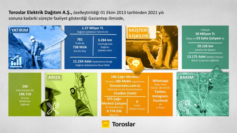 Toroslar Elektrik Dağıtım A.Ş. (Toroslar EDAŞ), 1 Ekim 2013 itibariyle hizmet vermeye başladığı Gaziantep’e kesintisiz enerji için toplam 1.37 milyar TL tutarında dağıtım şebekesi yatırımı yaptı. 8 yıl içerisinde 198.710 adet arızaya müdahale edilerek enerji arzı ve sürekliliği sağlandı.