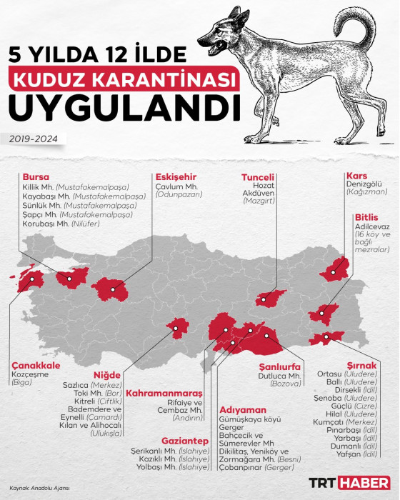 Son dönemde ülkemizde kuduz vakaları en yüksek seviyesini gördü. En son kuduz vakası Gaziantep'in İslahiye ilçesinde görüldü.Kuduz vakasının görüldüğü köy 6 ay karantinaya alındı, giriş çıkışlar kapatıldı.