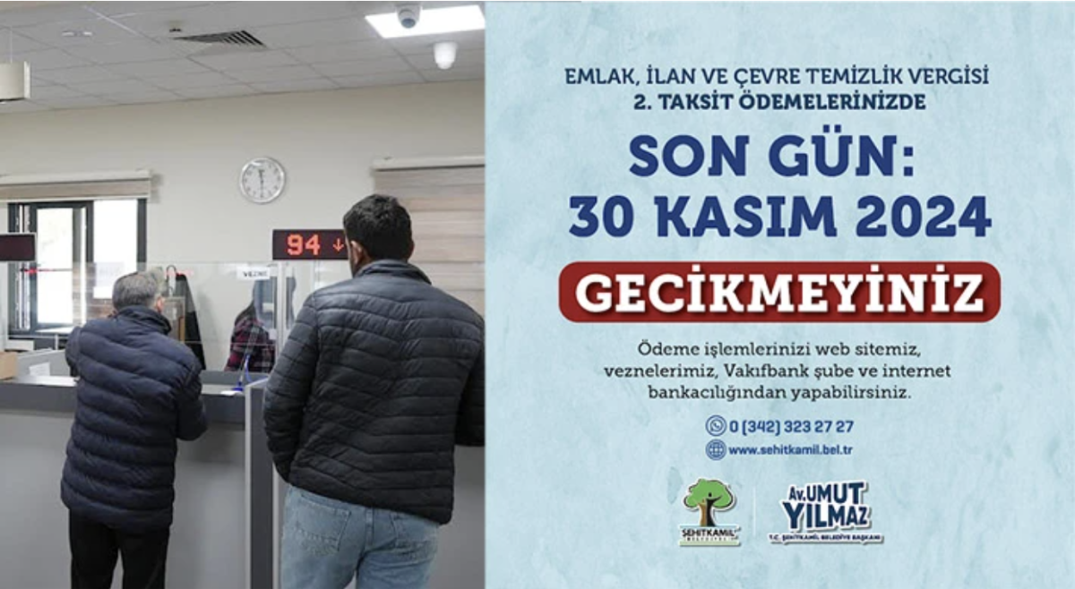 Şehitkâmil Belediyesi, emlak, ilan ve çevre temizlik vergisi 2. taksit ödeme süresinin 30 Kasım 2024 tarihinde sona ereceğini duyurdu.